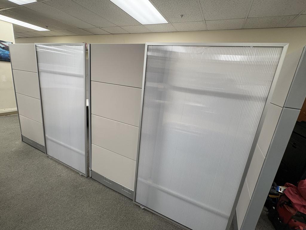Description We have this Herman Miller Ethospace that is 70” tall with sliding doors. We can make any size out of these stations from 5’x5’ to 8’x8’ or larger. Please let us know what size stations you need and we will make them to meet your floor plan in any fabric or paint style in stock. Surfaces come included with these stations, overheads, pedestals and laterals additional based on design and style. $1198 cluster formation $1399 straight line formation.