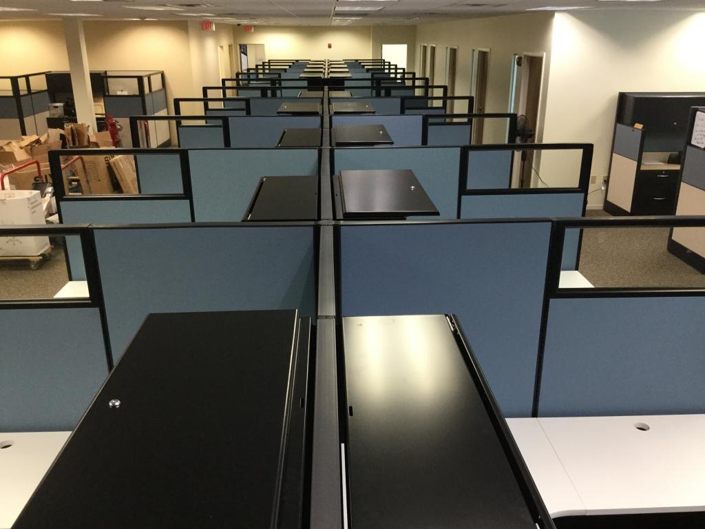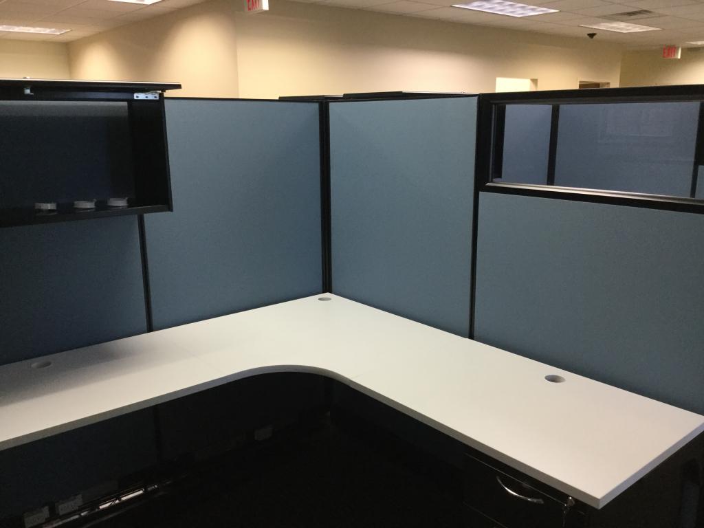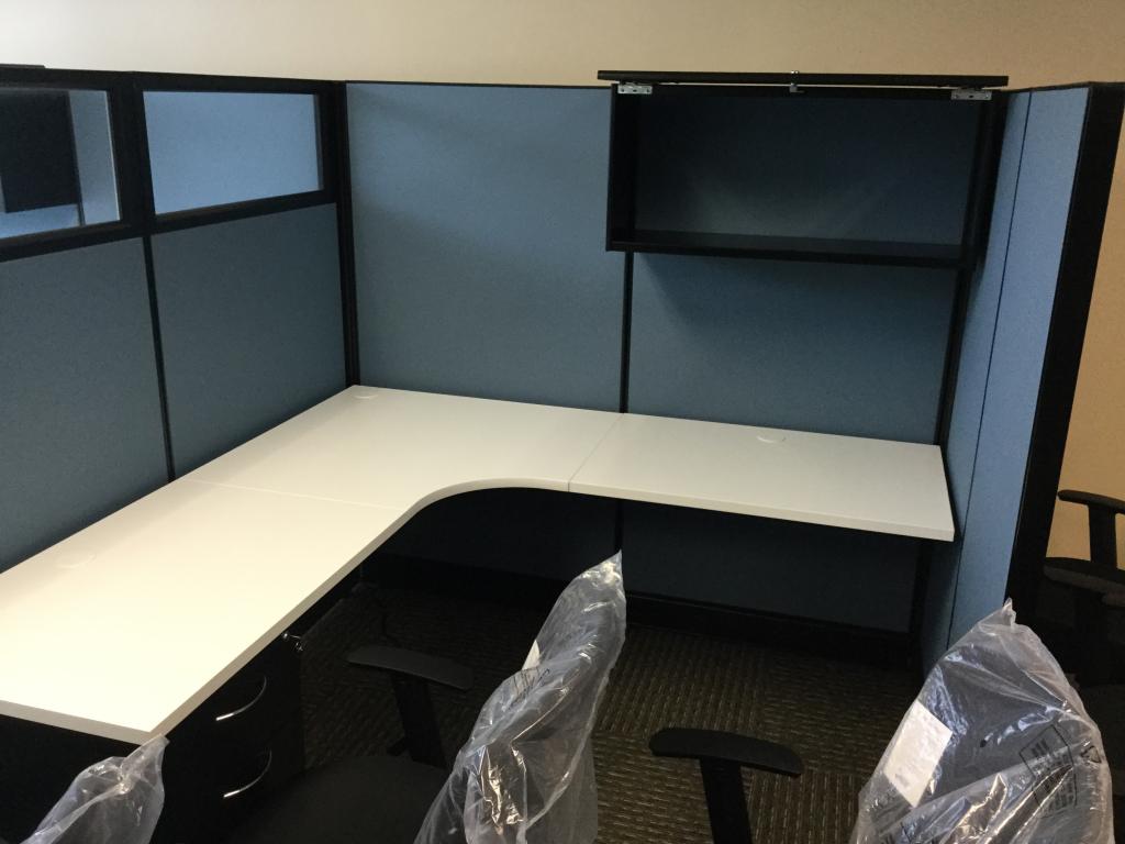 Description Very nice used office cubicles. 6 X 6, 67 inch high panels. 3 foot corner shelf and pedestal. Black trim, blue fabric, white surfaces *****New / Refurbished*****