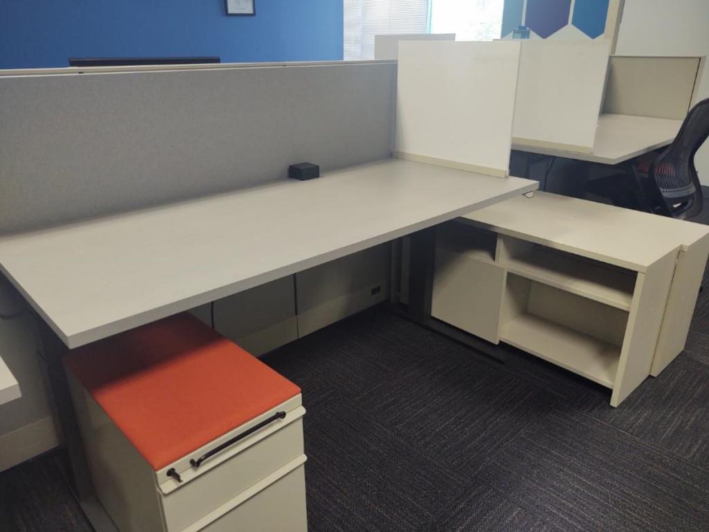 Mobile BF pedestal with cushion top and storage credenzas. Tackboard mounted on back of table. (1) side screen per table & (1) desk-height power cord. All individual units.