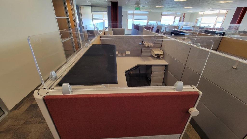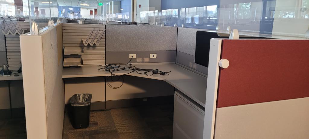 Description Herman Miller Ethospace 6'x6'x54"T. These stations come in a grey fabric with red accent tiles. They are a combination of 2', 3' and 4' panels so we can make any size at 54" tall.