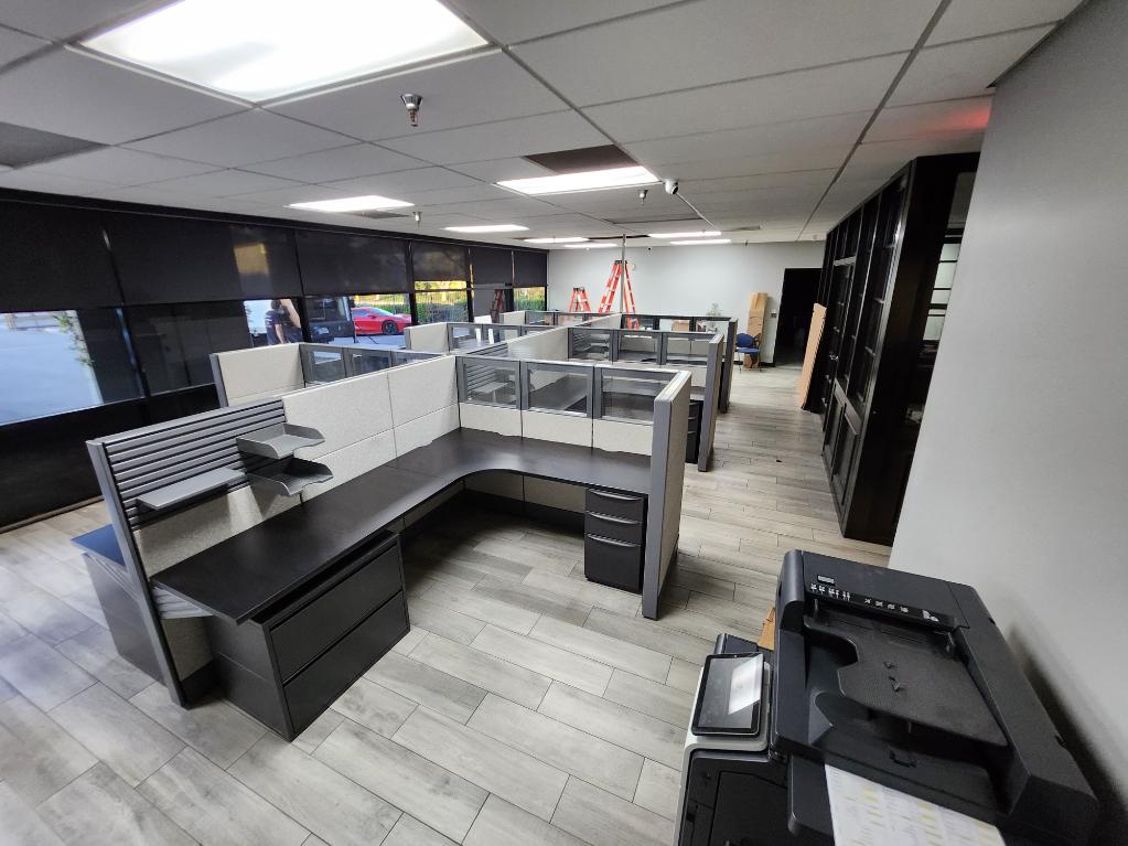Description We have these Herman Miller Ethospace that come with grey camo fabric naturally in a 6’x8’x54”T. We can also make these into 5’x5’x54”. These are with refurbished surfaces with new black Wilsonart laminate. We can re laminate the tops to be any finish you choose. Comes with a BBF pedestal or Lateral file cabinet and paper management trays.