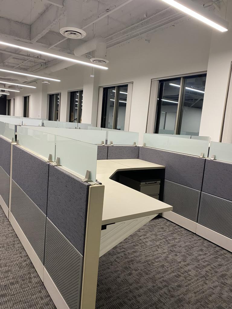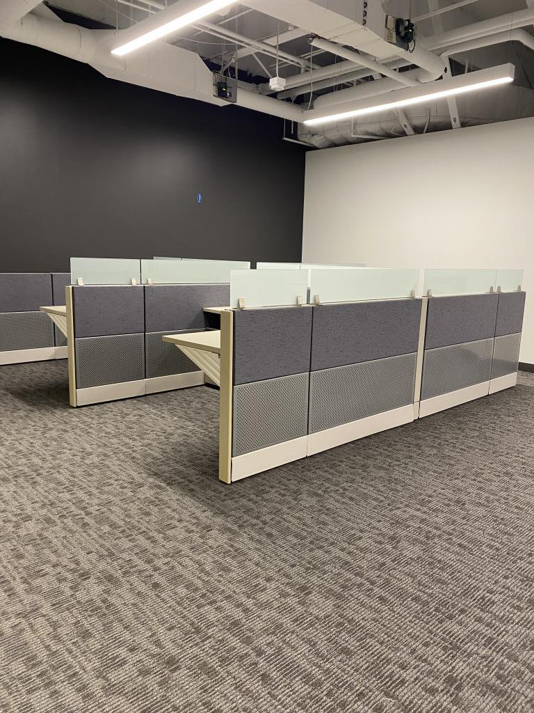 Description We have this 6x6 Herman miller Ethospace that is 46” tall with frameless glass. These stations are in excellent condition and have a metal bottom with a fabric top. $699 each cluster formation $899 each single run formation