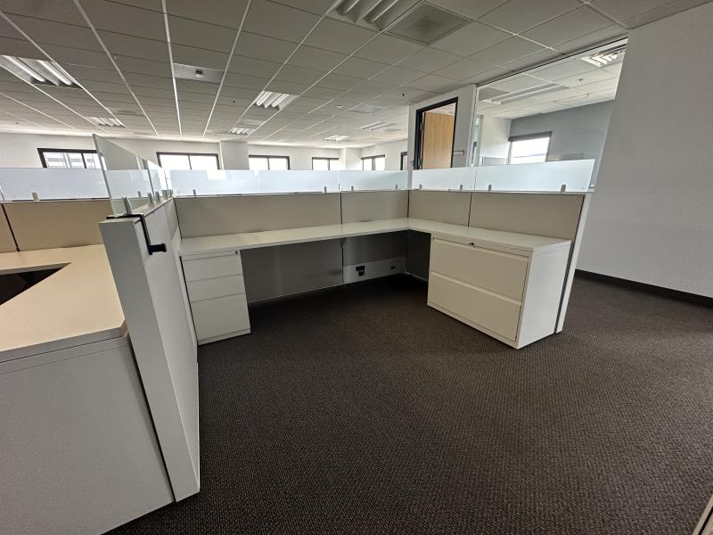 Description Would you look at these light and bright Haworth Compose stations? These are seated privacy with frameless glass stackers. Pictures shown are 8x6 but we can also make them into 6x5' size. With this look these stations won't last long.