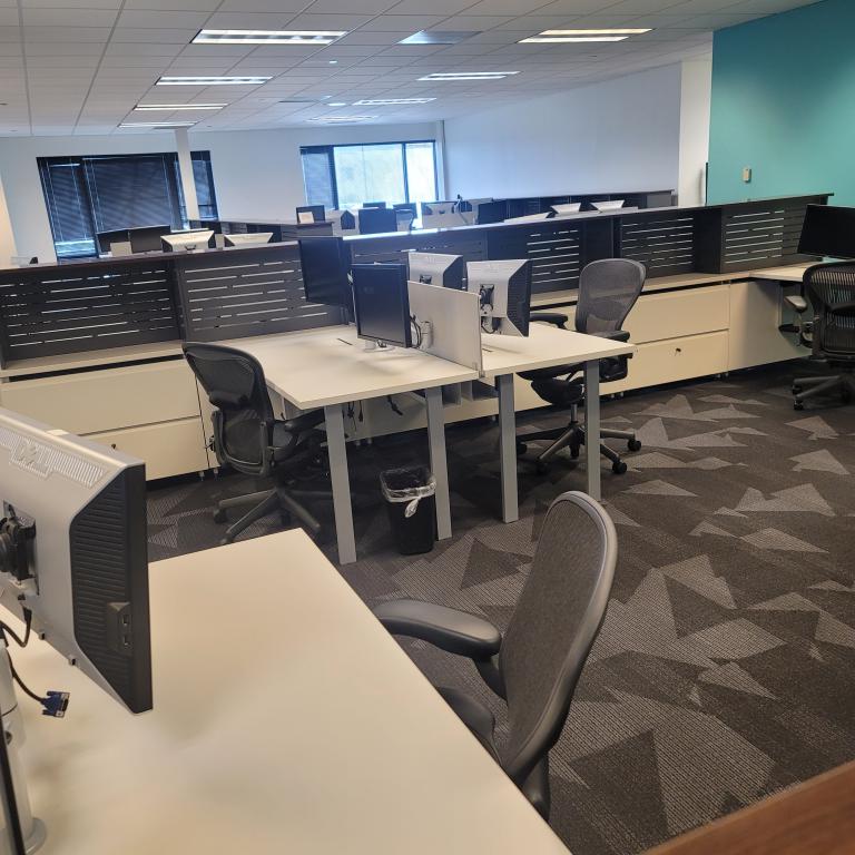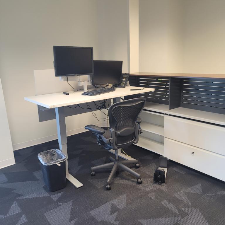 30x60 worksurface with reinforcement channel and dual monitor arm