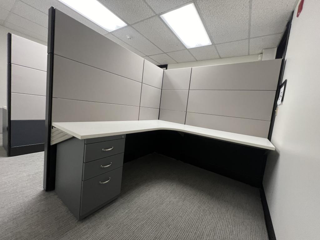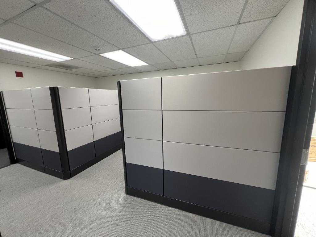 Description We have these Herman Miller Ethospace 6’x6’x70” black & silver refurbished with new fabric and painted trim. These station are in excellent condition and come with power on the spline and a bbf pedestal with each station.