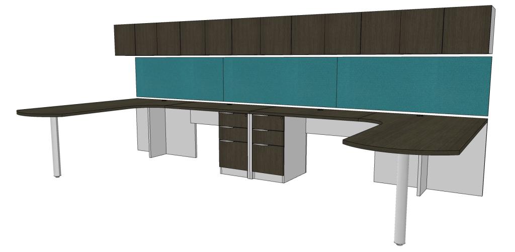 Description NEW Deskmakers two person desk setups. Great for maximizing an office space to accommodate two individuals while providing equal and adequate furniture and space for each side. Layouts, finishes, and sizing can all be modified to fit any space.