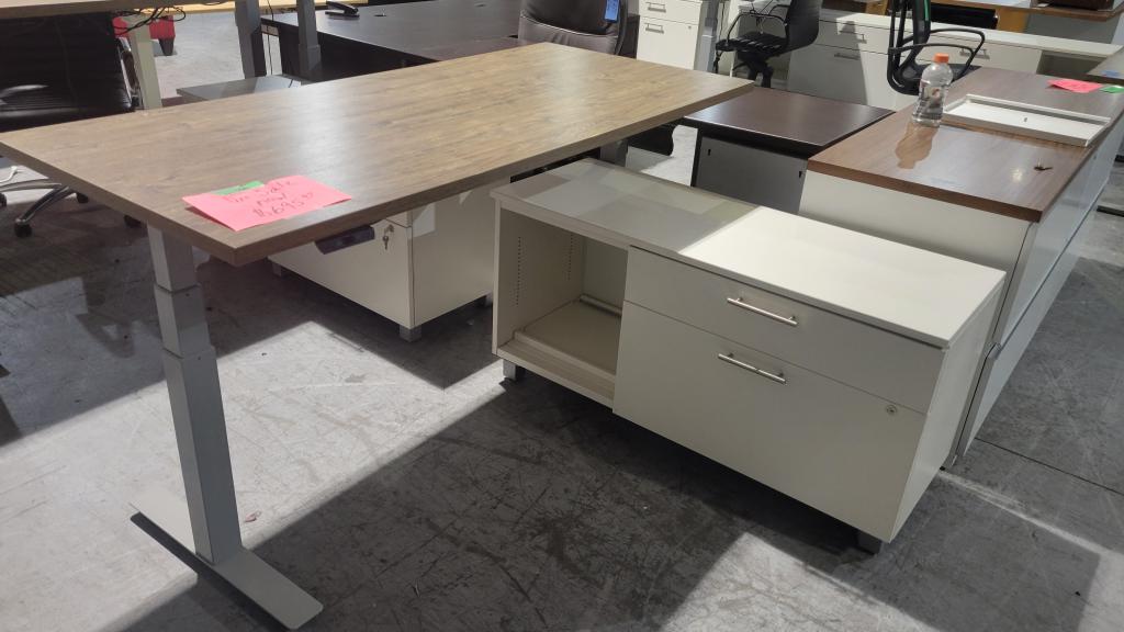 Description 5.5 Ft Walnut Sit-Stand Desk. Choice Sit-Stand Desk, fully electric with a 4 Ft White Return Credenza. Credenza has two inner shelves, one box drawer, and one lateral file drawer. Height-adjustable, ergonomic desk marked way below retail price.