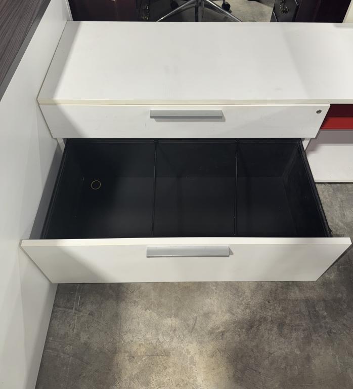 Description Allsteel L-shaped desk showcases a sleek, modern design with clean lines and a drop-down return in white laminate, accented by satin silver handles. It offers ample storage with a built-in box/box/file pedestal, a box/file lateral unit, and open shelving. The spacious work surface provides plenty of room for multitasking, making it both functional and stylish for any office.*WHS_0924* Dimensions Width: 72'' , Depth: 73''