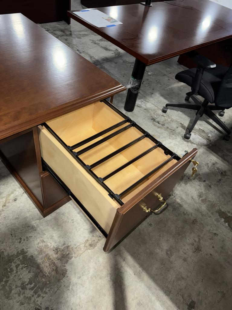 Description This traditional desk features a rich walnut finish, complemented by classic brass curved handles with rosettes that add a touch of elegance. It offers ample storage with a box/box/file drawer on one side for organizing small supplies and documents, and a file/file drawer on the other side for hanging folders and larger paperwork. The center drawer provides a convenient spot for everyday essentials. Its sturdy construction and timeless design make it a perfect addition to any home office or professional workspace.*WHS_1024*