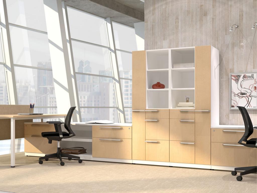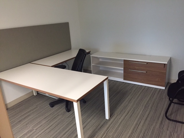 Description Friant Office Furniture Desks This is a project we recently did for a client who was looking for a sleek, contemporary look. Available in several work surface and paint colors, this client opted for a combination of white worksurfaces with walnut accents. There is a height adjustable return for a sit/stand option, a walnut accented credenza and a fabric tackboard. If you like this option call us, we would love to design a custom workspace for you!