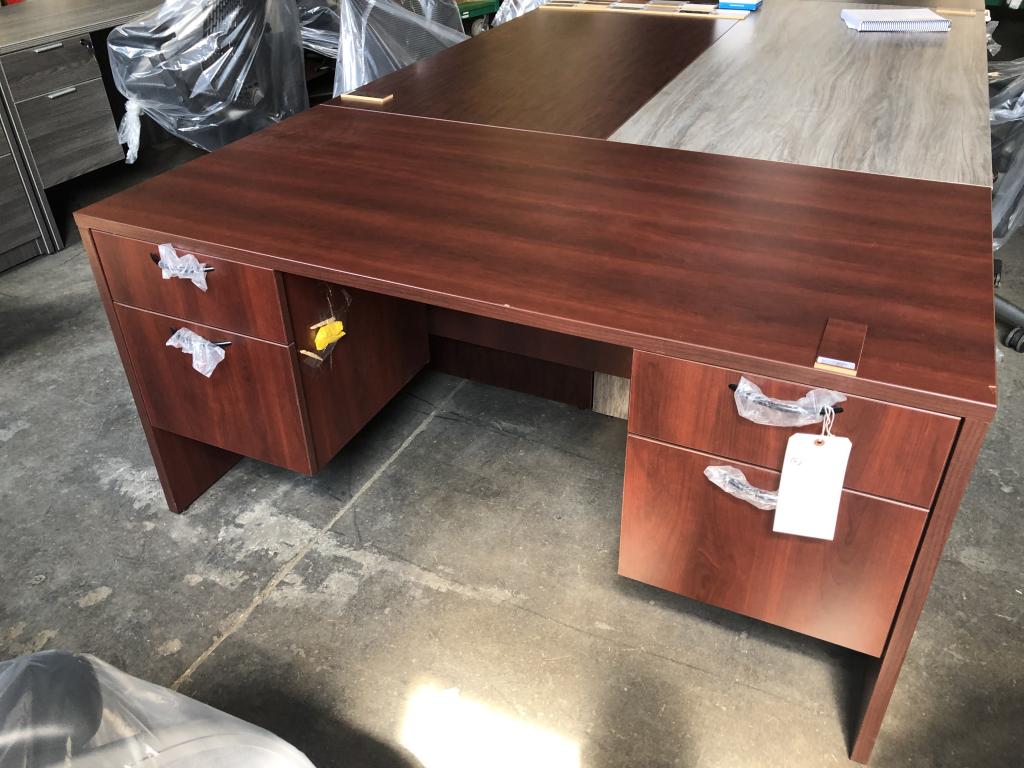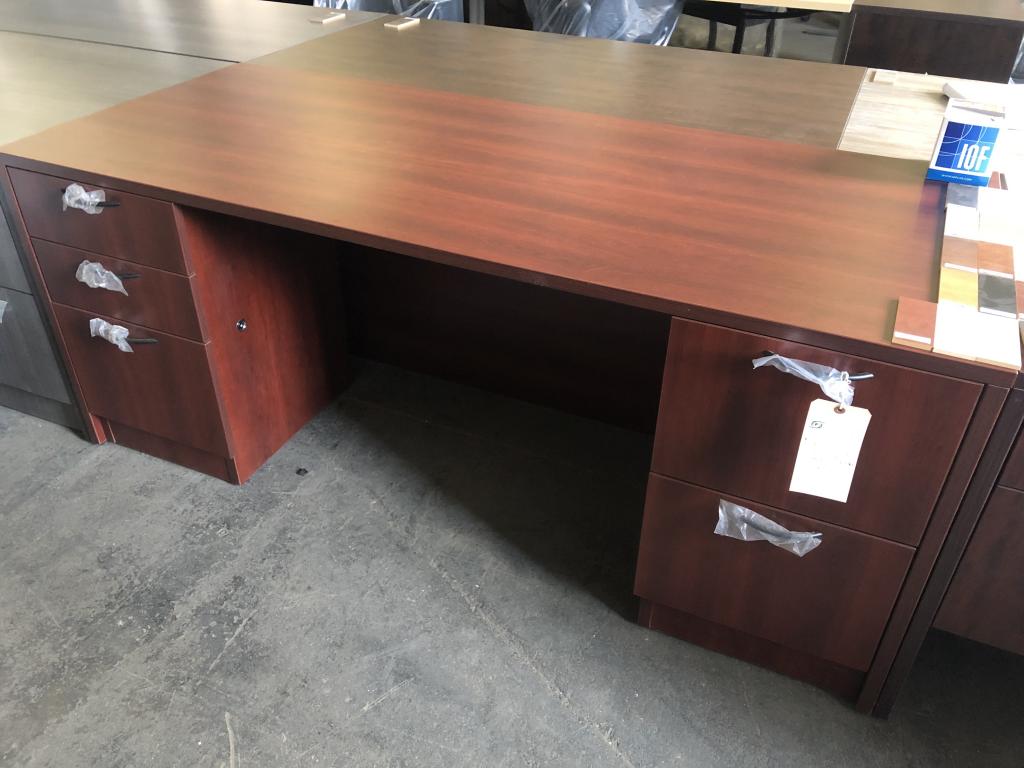 Description This double pedestal desk has two box/file pedestals with a 3/4 height modesty. Available in multiple laminate colors. We have several straight desks in-stock. Quantity discounts are available