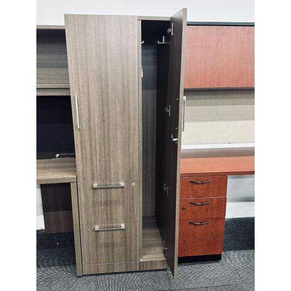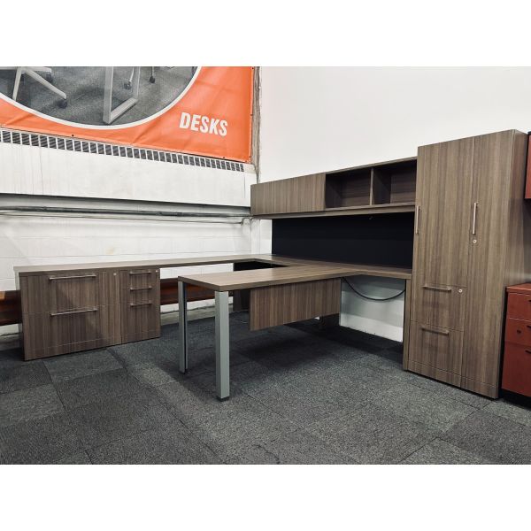 Description Pre-owned Steelcase Private Office U Shape Consist of - (1) 54" W x 24" D Brown laminate straight surface / (1) 96" W x 24" D brown laminate straight surface return / 90" W x 18" D x Brown laminate credenza with a 30" W 2H lateral file & (1) Box/Box/File pedestal / (1) Blue 96" W tackboard / (1) Overhead with (4) drawers and a sliding door / (1) Personal Tower with a wardrobe and (1) drawer that has 2 Shelfs and (1) File/File pedestal. Power grommet features - (2) Duplexes / (1) Data port. Left Handed.