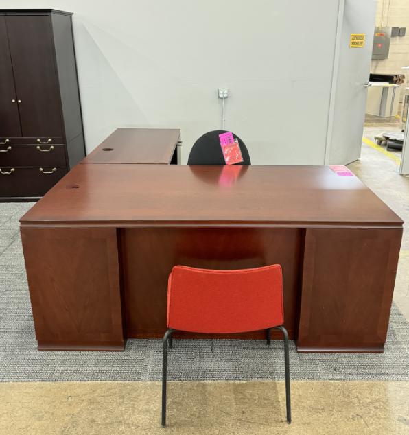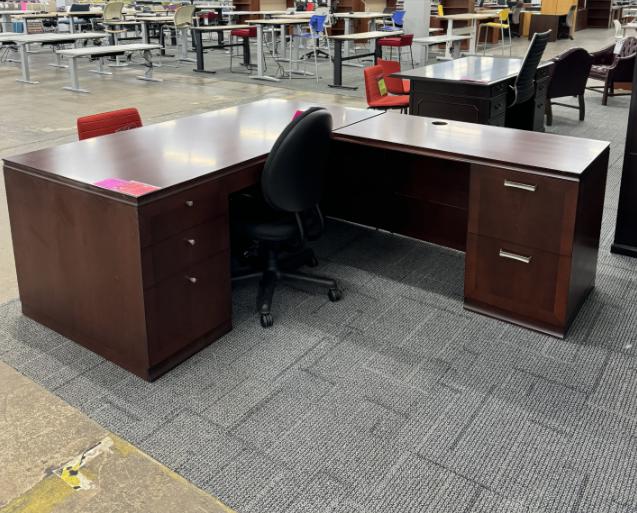 Description Check out our Decca wood L desks in Mahogany finish!