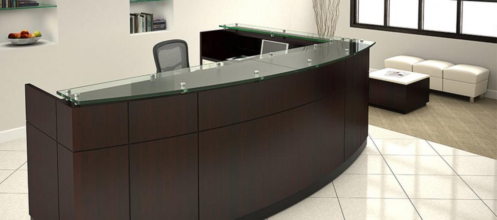Description Create a striking first impression with this new custom reception desk. It features an elegant bowfront design with laminate or wood veneer, a glass transaction top, and a three inch overhang on satin chrome stand-offs. It includes black reveal accents, with toekicks and pedestal pulls in black or satin finish. An elegant solution to your reception needs while still being affordable.