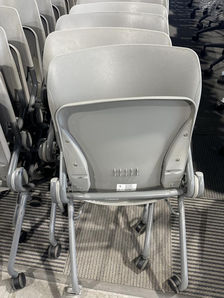 Description Nesting Chairs in Gray by KI On Casters 18" Seat D 16 1/2" Seat L 32" H used Chairs , w/ normal wear & tear, overall in good working condition (Minimum Order of 20 when shipping please)