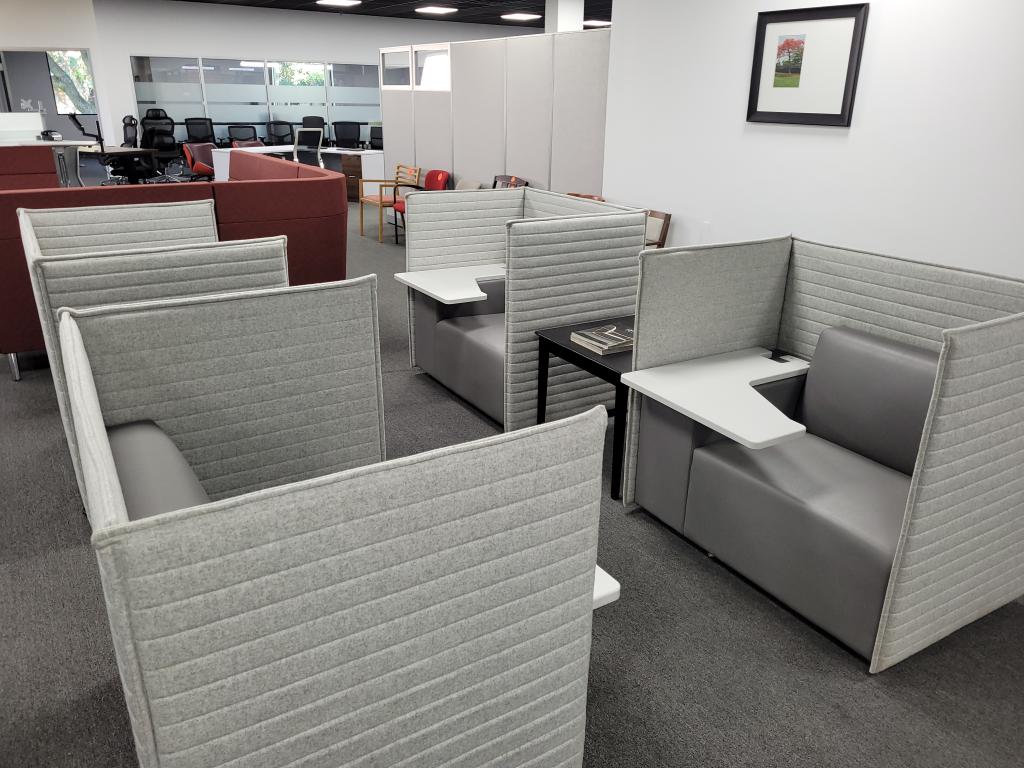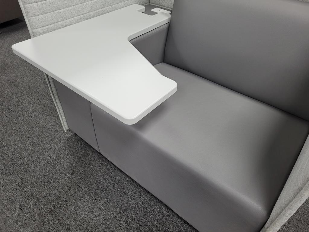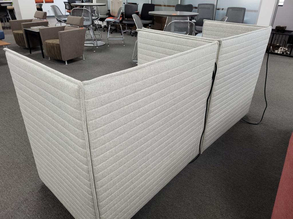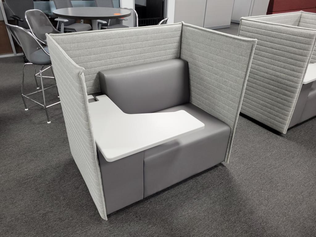 Description 45x36x43 gray fabric, tablet arm with privacy walls. USB and power built in. New list price is $5875.