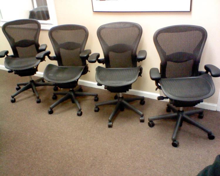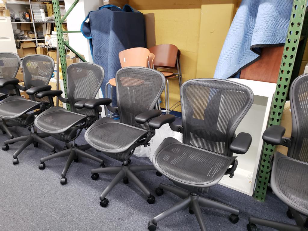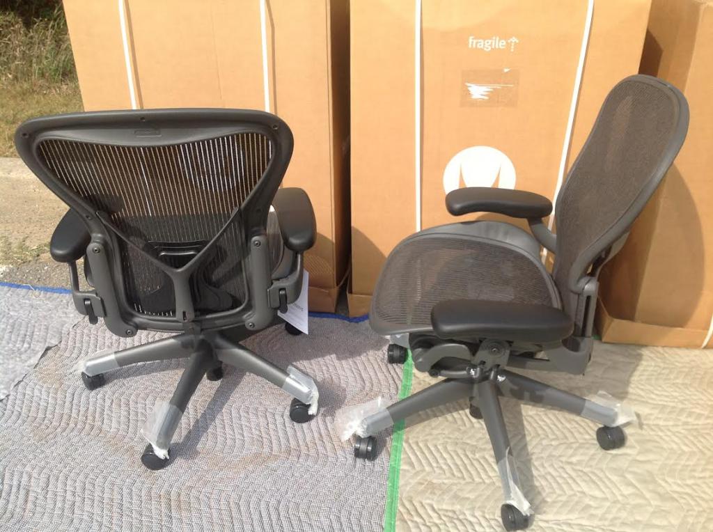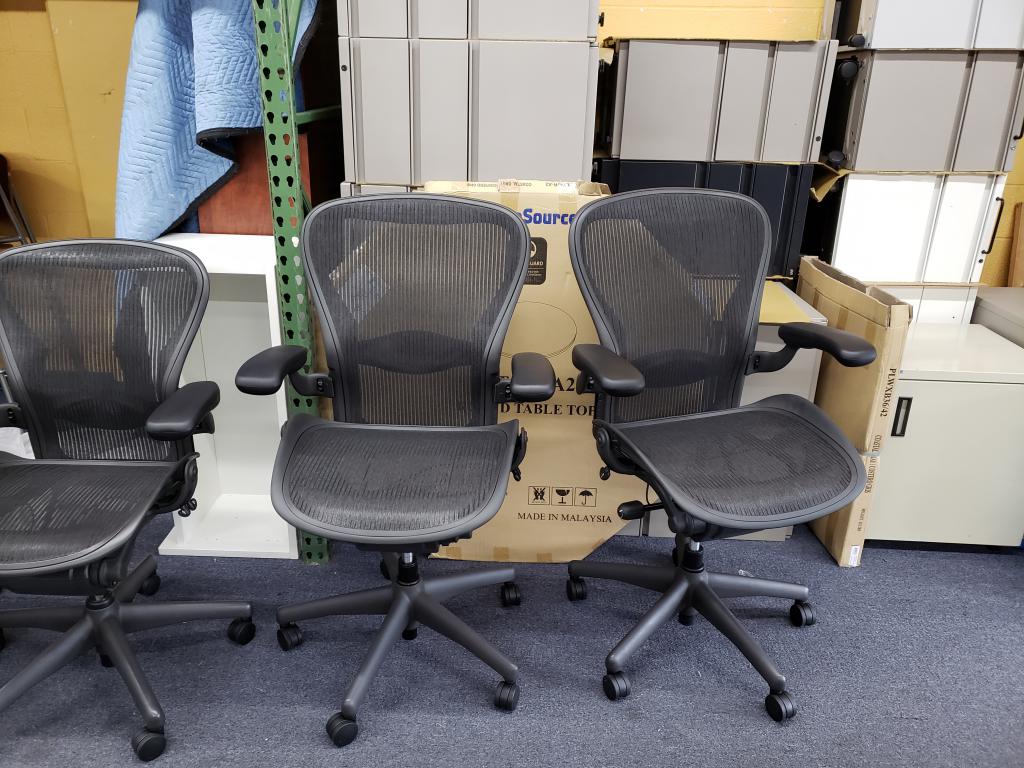 Description Herman Miller Aeron chairs in stock and ready to go. Sizes B's and C's. All chairs are fully loaded with Original all features available. All older chairs have been completely checked out and any broken parts replaced by our Mechanics with New original parts as needed. We also have Brand new replacement parts for the Aeron Chairs. Some Aerons Stools available in new condition also some Polished Aluminum Aerons in New Condition as well.