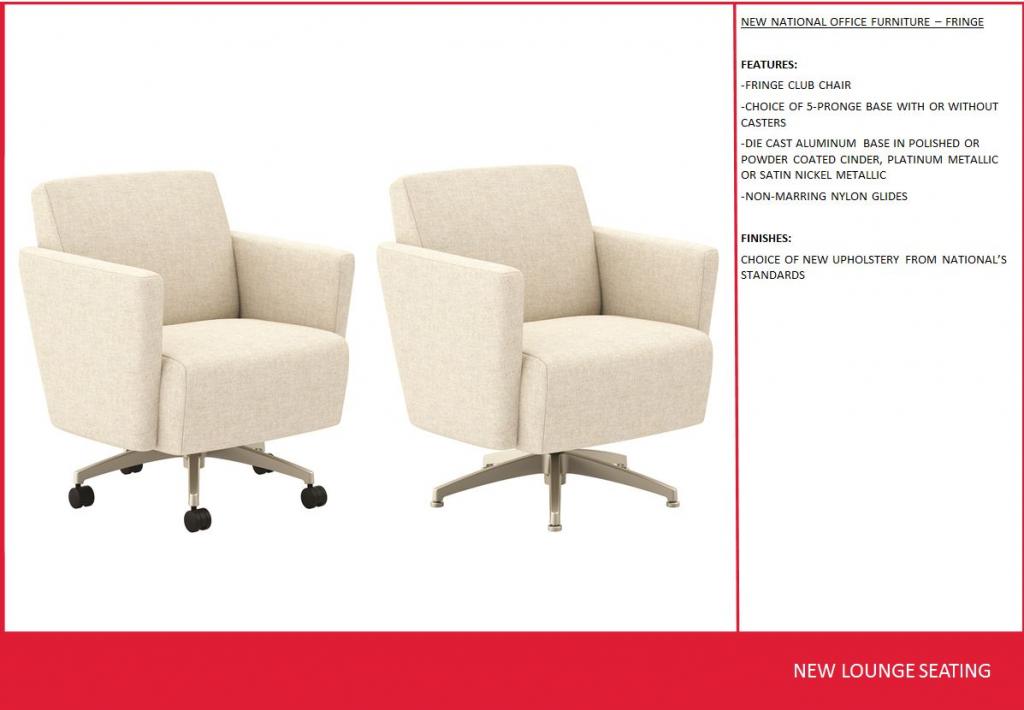 Description National Office Furniture Fringe Series Club chairs are available in a choice of base styles and a wide selection of fabrics and leathers to choose from.