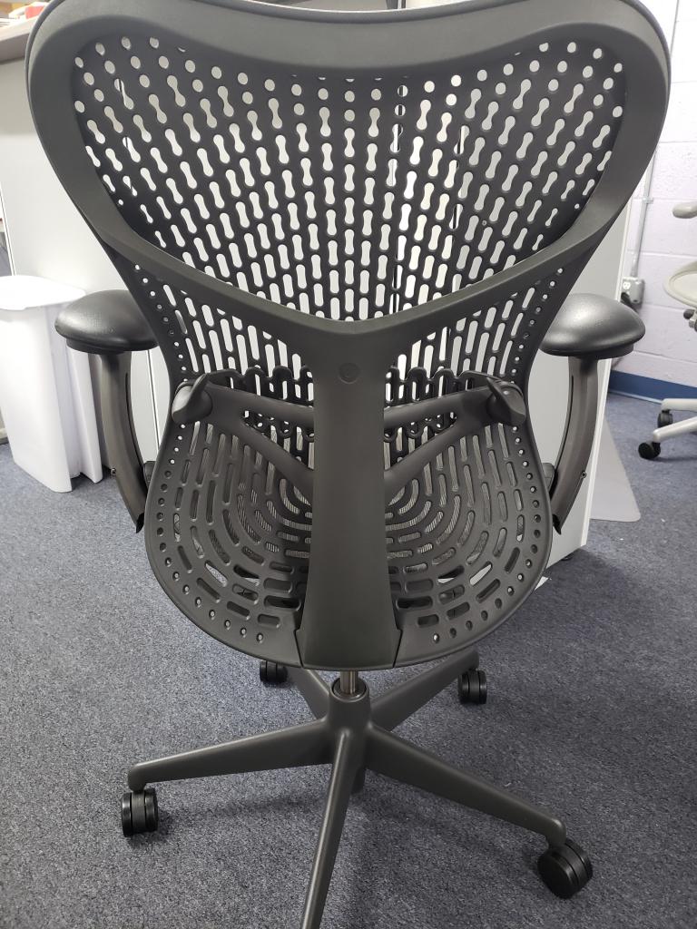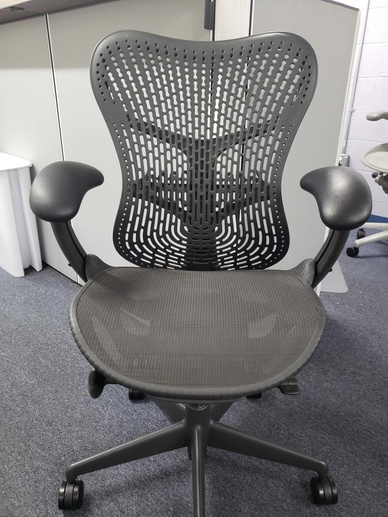 Description Herman Miller Mirra 2 Chairs, Charcoal / Graphite Color, Only 3 years old, & hardly used at all. Reconditioned w/ cleaning, factory paint touch up, & new Hardwood Castors. Fully Loaded with the following: Fully Adjustable Lumbar New Hardwood Castors Graphite Color Paint Touched Up Front Seat Lip Adjustment Forward & Rear Tilt Limiters Fully Adjustable up down arms & 4-way pivoting arm caps Upgraded Metal Base Not in DC? Here are more HM Chairs from our network: Used HM Chairs