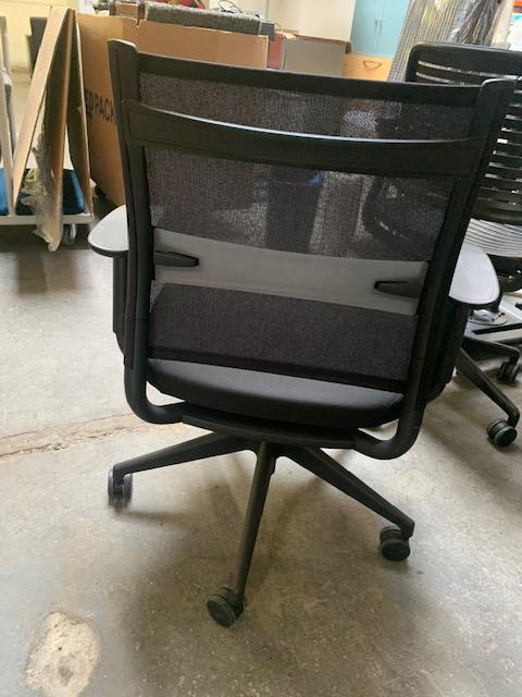 Description Supportive Mesh Back. Fabric seat. Adjustable Lumbar Support. Pneumatic lift. Waterfall seats. Swivel Tilt, synchro. Adj. arms.