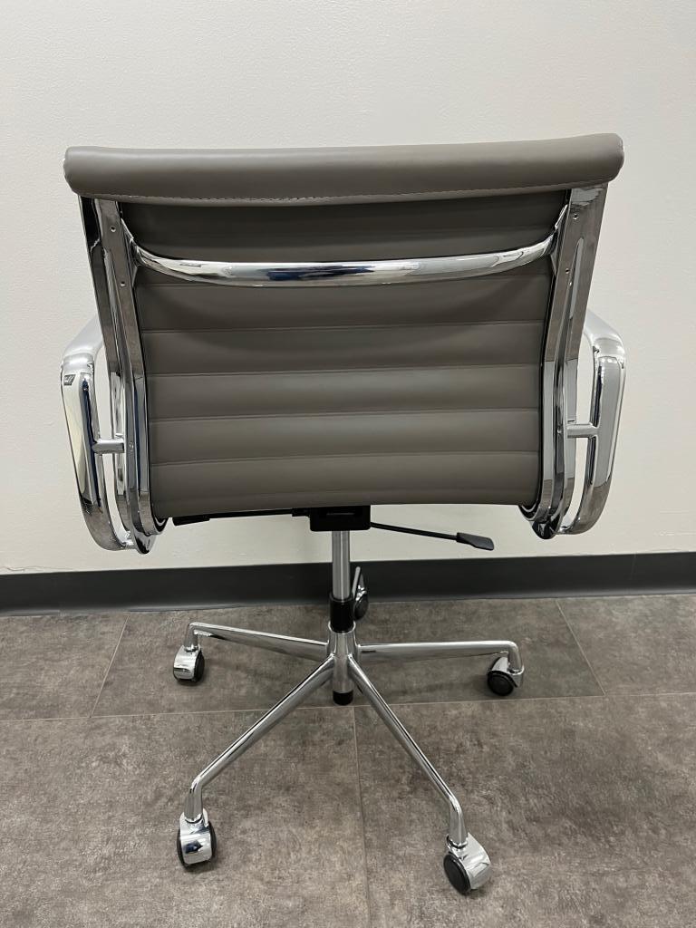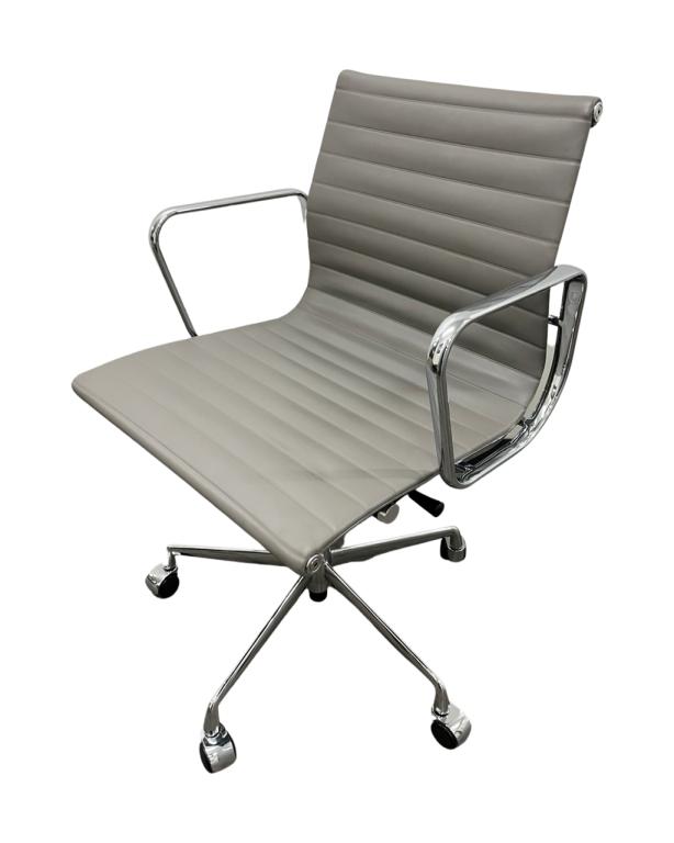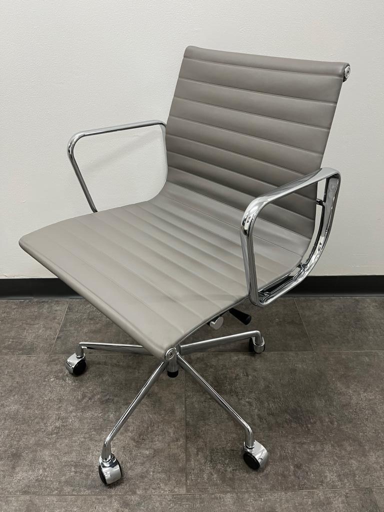 Description HERMAN MILLER EAMES REPLICA ALUMINUM GROUP SERIES EAMES ICONIC STYLING MID BACK SWIVEL TILTER TILT LOCK HEIGHT ADJUSTABLE GREAT CONFERENCE CHAIR GREY LEATHER CHROME FRAME 22.8"W x 23.2"D x 31.9" 35.2"H **NEW OPEN BOX**