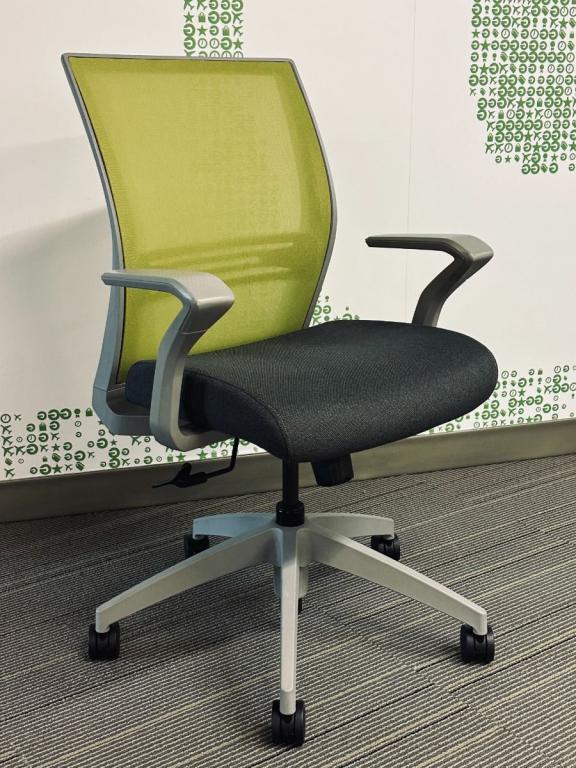Description Pre-owned SitOnIt Amplify Mid-Back Task Chair. Grey frame and base, apple green mesh back and black fabric seat. Features Height adjustable, adjustable lumbar support, swivel tilt, fixed arms, and waterfall seat. Dimensions: 40" H x 27.75" W x 27.75" D.