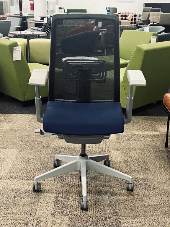 Description Pre-owned Haworth Very Task Chair. Grey Mesh back with a Blue upholstered seat and a silver 5 star base and frame color. Features: Pneumatic Height Adjustable Seat / Height Adjustable Arms / Tilt Lock / Tension Control / Lumbar Support. Dimensions: 27 1/4" W x 26" D x 45 1/4" H