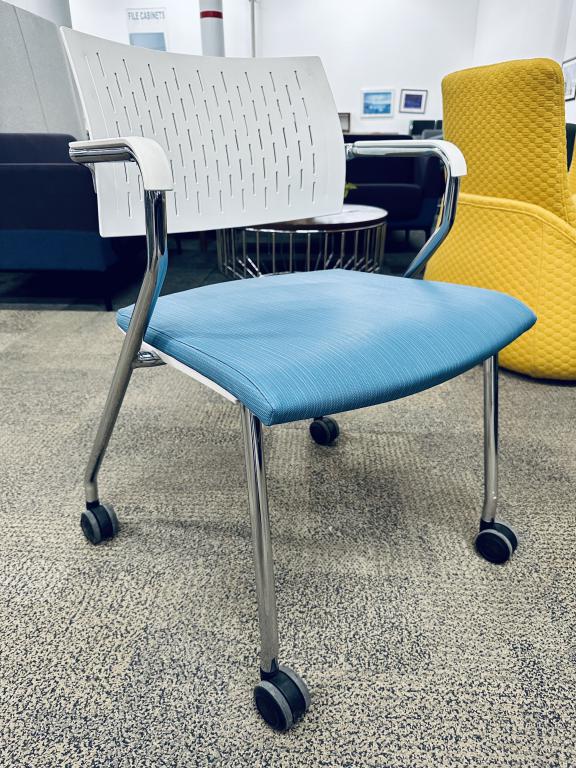 Description Pre-owned Keilhauer Scamper Mobile Guest Chair with a White plastic back and a Blue fabric seat, Polished Aluminum legs with casters. Dimensions: 21 1/4" W x 18 1/2" D x 31 1/2" H.