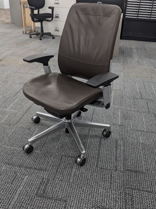 Description If your looking to spruce up your conference room table or your looking for a new office chair, our Steelcase Amia's is the perfect solution. The brown leather will give you that high end look. This chair is fully ergonomic & goes with an array of different body types.