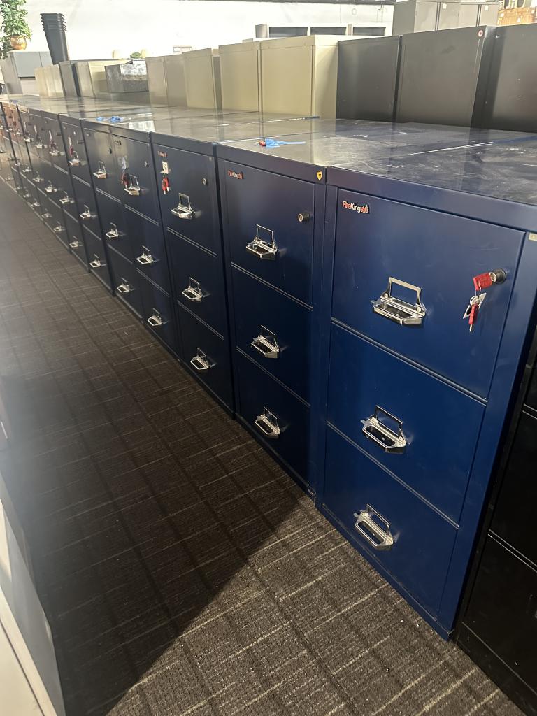 Description 3 DR Vertical Legal Size FireProof by FireKing in Blue Finish 21" L x 31 1/2" D x 40" H Rating 350/ 1 Hour 12 Matching Available Comes w/ Locks and Keys and Frames Used Files but in good working condition, comes w normal wear and tear