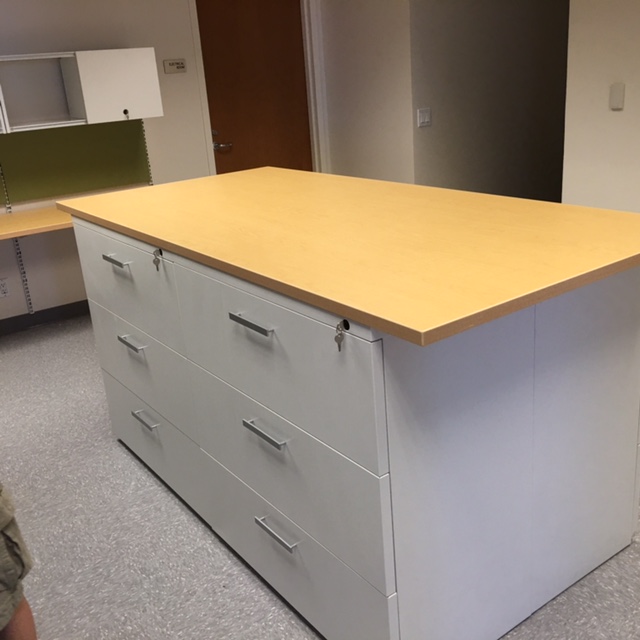 Description We had to get creative when a client asked us to design a dedicated storage space for them. We took some lateral files and placed a laminate top on them for additional workspace and storage. We have also taken some wall space and created some overhead storage as well as some desk space for copiers, faxes or other office equipment. We offer paper management systems, lateral files, vertical files, storage cabinets and bookcase options. Let us help design a storage space for you.