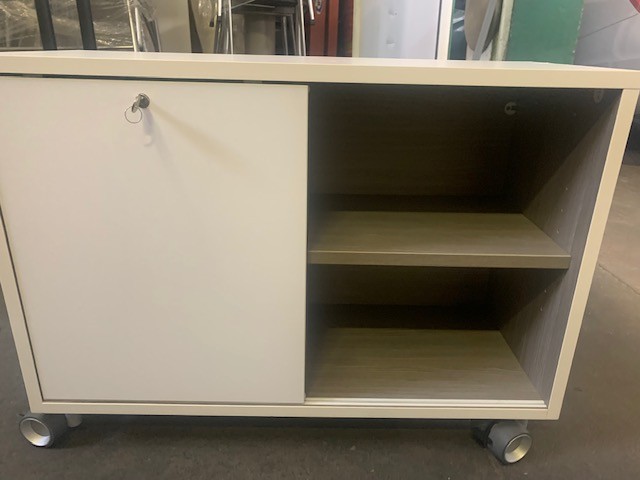 Description 30hxx30wx13d Large mobile wheels--lockable and locks in place. by Steelcase manu. Sliding doors.