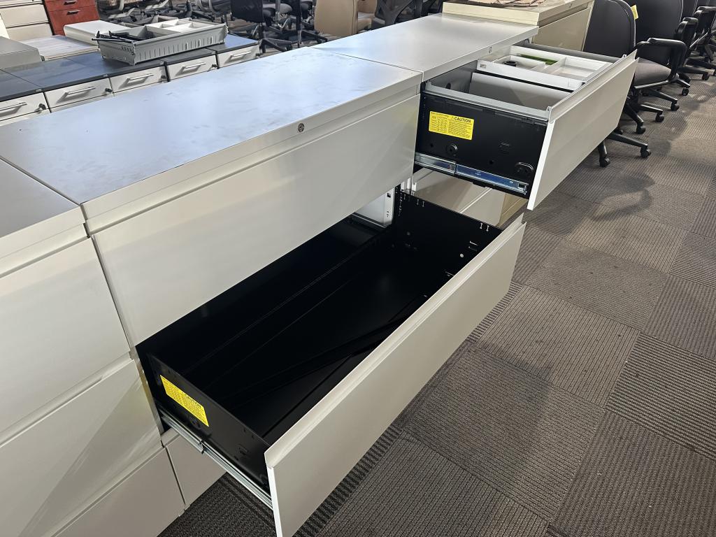Description 3 DR Lateral File Cabinet by Haworth in White Metal Finish 36" x 19" D x 39" H Comes w/ Frames For Folders Comes w/ Keys and Locks 7 Matching Like This used File , w/ normal wear & tear, overall in good working condition