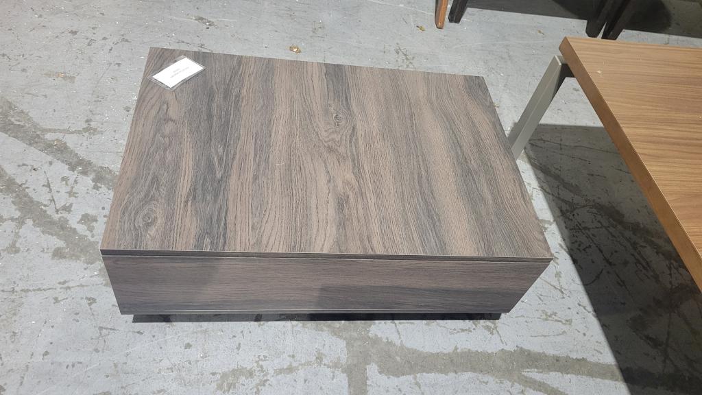 Description Aran Lift-Top Coffee Table - Showroom Model. Walnut table with lifting top for storage underneath. Contemporary table for any living area.