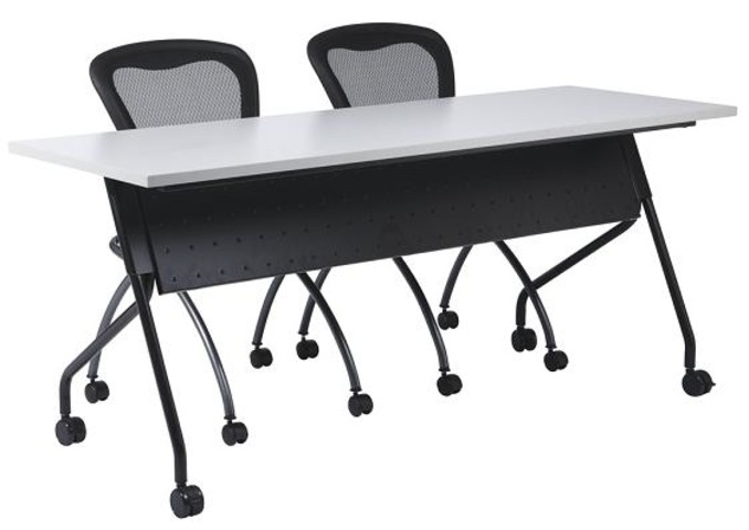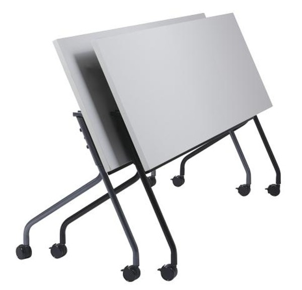 Description Budget friendly Office Star training tables feature a flip top that permits nesting for easy reconfiguration and storage when not in use. Top locks into position whether upright or horizontal. Frames are available in wither Titanium or Black, and have a modesty panel and 4 locking casters. Tops are 1" thick and feature a smooth, impact resistant 3mm PVC edge, and are available in Maple, Cherry, Mahogany, and Grey. Tables also feature a ganging mechanism, and trapezoid and half-moon shapes are also available for additional configuration options. Request a quote today!