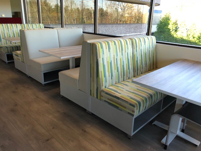 Description New Cafeteria tables in several shapes, sizes and heights - rectangular, square, round. Lots of laminate colors to chose from. Tables can be paired with easily cleaned plastic stacking chairs and/or colorful banquette seating.