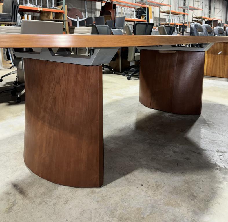 Description This sleek, 8-foot oval conference table, finished in warm cherry laminate, features two sturdy, chunky bases. It offers ample room for collaboration and can seat up to eight people, adding a touch of sophistication to any office.*WHS_0724*